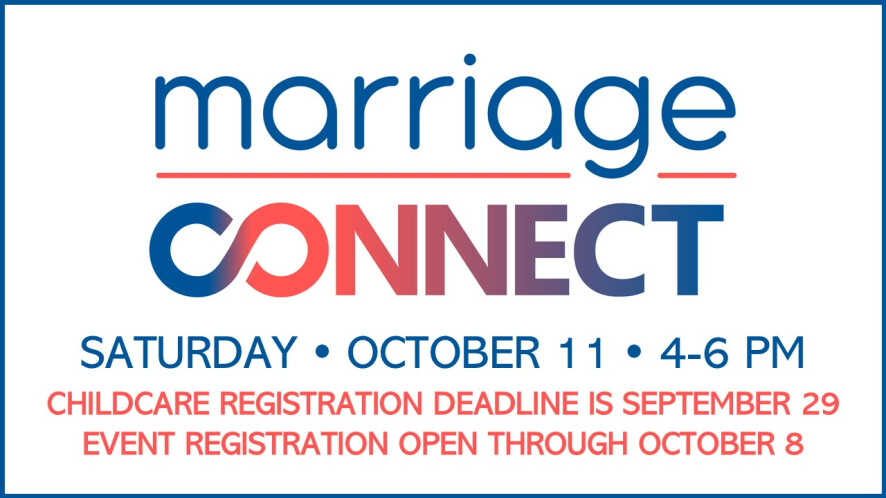 Join us for Marriage Connect on Saturday, October 11th from 4-6pm. There will be snacks and drinks provided. Further details will be communicated the week of the event.